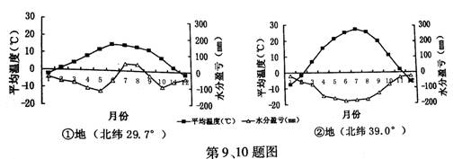 水分盈亏量是降水量减去蒸发力的差值,反映气候的干湿状况。当水分盈亏量>0时,表示水分有盈余,气候湿润;当水分盈亏量<0时,表示水分有亏缺,气候干燥。下图为我国两地年内平均水分盈亏和温度曲线图。读图,完成第9、10题。