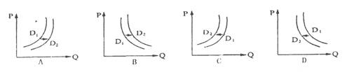 24.2014年3月27日,我国汽油价格年内第四次调整,每吨降低l35元,四次累计整体每吨下降l85元。汽油价格的下降影响到了汽车的市场需求量,不考虑其他因素,下列图示(横轴为汽车需求量,纵轴为汽车价格,D1为汽油降价前曲线,D2为汽油降价后曲线)最能正确反映这一信息的是