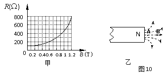 16. 物理学中,用磁感应强度(用字母B表示,国际单位:特斯拉,符号是T)表示磁场的强弱,磁感应强度越大,磁场越强。用某种材料制成的磁敏电阻,其阻值R随磁感应强度的变化图像如图10(甲)所示,由图像可知磁敏电阻的阻值随磁感应强度B的增大而