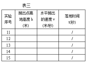 ⑤小明和小亮发现落地点与抛出点的水平距离L与水平抛出的速度v的比值就是物体的落地时间,为了验证上一题的结论,他们调整实验器材继续实验,他们设计了表三用以记录相关数据,请你完成表三中空缺的栏目。 (18)