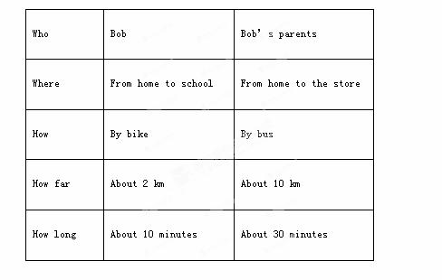 假如Bob 是你的朋友,他是一名学生,他父母在同一家服装店上班。根据下面表格中的内容用英语写一篇短文描述他一家人上学及上班的情况。
