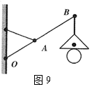 16.如图9所示,质量忽略不计的硬棒OB,可以绕固定在墙上的O点转动,B端挂一盏电灯,通过系在A点的线绳将硬棒OB固定。请画出动力F1、动力臂L1和电灯的重力G。