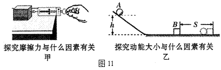 (1)当要研究的物理量不易直接测量时,都要想办法把它们的大小间接表示出来,如图11所示:甲实验是让木块在水平面上做 运动,通过读取弹簧测力计上的示数间接知道 的大小;乙实验中小球动能的大小是通过观察比较 反映出来的。