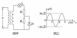 10. 如图甲所示,一个理想变压器原、副线圈的匝数比n1∶n2=6∶1,副线圈两端接有灯泡(3 V 3 W)、定值电阻R1=3 Ω、R2=6 Ω、理想二极管D,当原线圈两端接有电压按如图乙所示变化的交流电源时,则( )