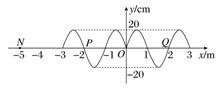 解析: 应用P、Q两点关于波源O对称,此时P、Q两点运动方向相同,选项A正确;该波波长为2 m,周期为0.4 s,再经过0.5 s质点N刚好在(-5 m,20 cm)位置,选项B正确;根据波发生干涉的条件,能与该波发生干涉的横波的频率一定为2.5 Hz,选项C错误;波的频率与波源的振动频率相同,选项D错误.
