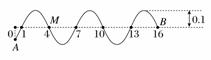 解析: 波向右传播,则B点向上起振,振源A的起振方向向上,A项错误;波由A点传到B点,需要时间t== s=1.6 s,B项正确;由题图可知,波长为6 m,所以周期T=λ/v=0.6 s,图示时刻振源A正向下运动,但还没到波谷位置,所以要到达波峰需要的时间大于半个周期,即大于0.3 s,C项错误;由图可知,M、B两点相距两个波长,即此时M点已振动了两个周期,M点通过的路程应为8A=0.8 m,D项错误.