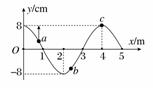 解析:由t=0时刻质点a振动方向沿y轴正方向可知,该波沿x轴正方向传播,故质点b向y轴负方向振动、质点c也向y轴负方向振动,a、b、c中第一次最先回到平衡位置的是c;由t=0.02 s时,质点c第一次到达波谷处可知振动周期T=0.04 s,又A=8 cm,初相位φ0=-,所以c点的振动方程为y=8sin(50πt-) cm.