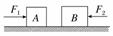 3. 如图所示,在光滑水平面上,用等大反向的力F1、F2分别同时作用于A、B两个静止的物体上.已知mA<mB,经过相同的时间后同时撤去两力,以后两物体相碰并粘为一体,则粘合体最终将( )