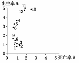 读“不同国家出生率、死亡率统计图(图中1~12代表国家)”。据此完成10~11题。