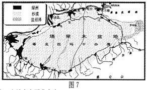 读塔里木盆地的沙漠与绿洲图(图7),回答14~15题。