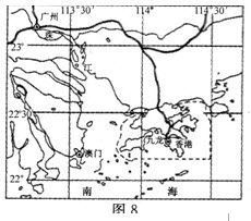 香港与澳门分别位于珠江口的东、西两侧。长期以来,港澳与祖国内地一直保持着密切的经济联系。结合珠江三角洲图(图8),回答16~l8题。