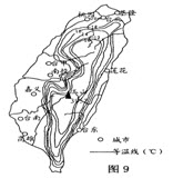 台湾岛以热带和亚热带季风气候为主,中东部是呈东北—西南走向的台湾山脉,因而森林树种十分丰富。结合台湾岛气温分布图(图9),回答19~20题。