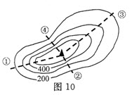 22.图中虚线表示的四条登山线路,坡度最缓的是
