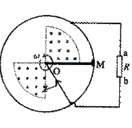 (2009年宁夏卷)19.如图所示,一导体圆环位于纸面内,O为圆心。环内两个圆心角为90°的扇形区域内分别有匀强磁场,两磁场磁感应强度的大小相等,方向相反且均与纸面垂直。导体杆OM可绕O转动,M端通过滑动触点与圆环良好接触。在圆心和圆环间连有电阻R。杆OM以匀角速度