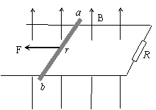 (2009年福建卷)18.如图所示,固定位置在同一水平面内的两根平行长直金属导轨的间距为d,其右端接有阻值为R的电阻,整个装置处在竖直向上磁感应强度大小为B的匀强磁场中。一质量为m(质量分布均匀)的导体杆ab垂直于导轨放置,且与两导轨保持良好接触,杆与导轨之间的动摩擦因数为u。现杆在水平向左、垂直于杆的恒力F作用下从静止开始沿导轨运动距离L时,速度恰好达到最大(运动过程中杆始终与导轨保持垂直)。设杆接入电路的电阻为r,导轨电阻不计,重力加速度大小为g。则此过程