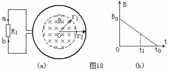 的圆形金属线圈与阻值为2R的电阻R1连接成闭合回路。线圈的半径为r1。在线圈中半径为r2的圆形区域内存在垂直于线圈平面向里的匀强磁场,磁感应强度B随时间t变化的关系图线如图18(b)所示。图线与横、纵轴的截距分别为t0和B0。导线的电阻不计。求0至t1时间内