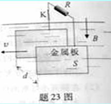 23.(重庆卷)(16分)法拉第曾提出一种利用河流发电的设想,并进行了实验研究。实验装置的示意图可用题23图表示,两块面积均为S的矩形金属板,平行、正对、竖直地全部浸在河水中,间距为d。水流速度处处相同,大小为v,方向水平。金属板与水流方向平行。