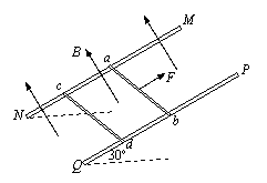 14.(2011年高考·天津理综卷)如图所示,两根足够长的光滑平行金属导轨MN、PQ间距为l=0.5m,其电阻不计,两导轨及其构成的平面均与水平面成30º角。完全相同的两金属棒ab、cd分别垂直导轨放置,每棒两端都与导轨始终有良好接触,已知两棒质量均为m=0.02kg,电阻均为R=0.1Ω,整个装置处在垂直于导轨平面向上的匀强磁场中,磁感应强度B=0.2T,棒ab在平行于导轨向上的力F作用下,沿导轨向上匀速运动,而棒cd恰好能够保持静止。取g=10m/s2,问