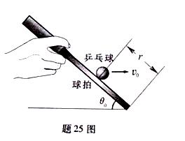 25.(2012重庆)(19分)某校举行托乒乓球跑步比赛,赛道为水平直道,比赛距离为S,比赛时,某同学将球置于球拍中心,以大小a的加速度从静止开始做匀加速运动,当速度达到v0时,再以v0做匀速直线运动跑至终点。整个过程中球一直保持在球中心不动。比赛中,该同学在匀速直线运动阶级保持球拍的倾角为θ0 ,如题25图所示。设球在运动过程中受到的空气阻力与其速度大小成正比,方向与运动方向相反,不计球与球拍之间的摩擦,球的质量为m,重力加速度为g