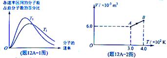 (2012 江苏)(2)密闭在钢瓶中的理想气体,温度升高时压强增大,从分子动理论的角度分析,这是由于分子热运动的_______增大了,该气体在温度为T1、T2时的分子速率分布图像如题12A-1图所示,则T1_______(选填“大于”或“小于”)T2