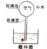 (2012重庆)16.题16图为伽利略设计的一种测温装置示意图,玻璃管的上端与导热良好的玻璃泡连通,下端插入水中,玻璃泡中封闭有一定量的空气。若玻璃管中水柱上升,则外界大气的变可能是