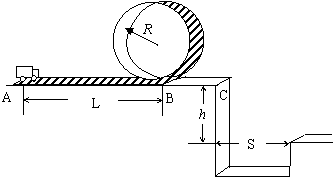(2009年浙江卷)24.某校物理兴趣小组决定举行遥控塞车比赛。比赛路径如图所示,赛车从起点A出发,沿水平直线轨道运动L后,出B点进入半径为R的光滑竖直圆轨道,离开竖直圆轨道后继续在光滑平直轨道上运动到C点,并能越过壕沟。已知赛车质量m=0.1kg,通电后以额定功率ρ=1.5W工作,进入竖直圆轨道前受到的阻值为0.3N,随后在运动中受到的阻力均可不计。图中L=10.00m,R=0.32m,h=1.25m,S=1.50m。问:要使赛车完成比赛,电动机至少工作多长时间?(取g=10 m/s2)