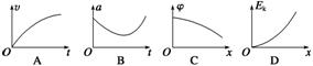 ,一带正电的粒子从直线上的O点由静止开始在电场力作用下运动到A点,取O点为坐标原点,沿直线向右为x轴正方向,粒子的重力忽略不计.在O到A运动过程中,下列关于粒子的运动速度v和加速度a随时间t的变化、粒子的动能Ek和运动径迹上电势φ随位移x的变化图线可能正确的是 ( )