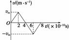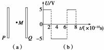 9.如图9(a)所示,两个平行金属板P、Q竖直放置,两板间加上如图(b)所示的电压.t=0时,Q板比P板电势高5 V,此时在两板的正中央M点有一个电子,速度为零,电子在电场力作用下运动,使得电子的位置和速度随时间变化.假设电子始终未与两板相碰.在0<t<8×10-10 s的时间内,这个电子处于M点的右侧,速度方向向左且大小逐渐减小的时间是 ( )