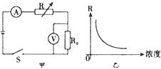 17、小华同学设计了一个检测天然气泄漏的电路如图所示.电源电压恒定不变;R0为定值电阻;R为气敏电阻,其阻值随天然气浓度变化曲线如图乙所示.下列说法正确的是( )