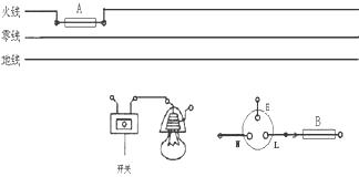 35、家庭电路应特别注意安全用电,如下右图所示的是安装一盏螺丝口电灯和一个大功率插座的实物示意图,A、B为保险丝,
