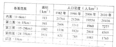 (一)我国北方某大城市自1982年以来,人口大幅度增加,下表为该城市各国人口密度、面积等数据。读表,回答问题。