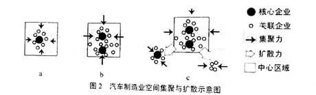 42、图2显示汽车制造业空间演变的一般过程,如图2a所示,在市场等因素的驱动下,在 中心区形成汽车核心企业,上、下游的关联企业都集聚而来,形成由核心企业一关联企业组成的汽车产业链。如图2的b、c、图,进一步阐述汽车制造业空间演变的过程和原因。