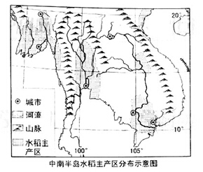 44、阐述中南半岛自然地理环境特征,分析这些特征对该区域水稻主产区、人口和城市分布的有利影响。(14分)