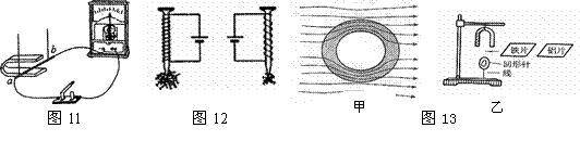 26、如图11是研究 现象的实验装置。实验时,要使电流表的指针摆动,应先闭合开关,然后让导线ab (上下/左右)运动。