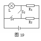 34、如图19,电源电压恒定,R2=16Ω,当S1、S2都闭合时,通过R1、R2的电流分别为2A和0.5A;当S1、S2都断开时,灯L恰能正常发光,且灯的电功率与R1的电功率之比为3∶1。