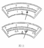 ⑵ 小明把电路连接正确后,闭合开关测量了三组不同的电压与电流的数值,其中两次已填在下表中,第一次实验的电压、电流如图13所示,请把观测到的电压与电流数值填在表格中,小明通过表格数据,得知小灯泡的额定功率为 W。