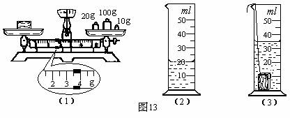 23、(注:原扫描版这题极端模糊,所以本题有改动,但题意不变)小明为了测量一块金属块的密度,进行了如下实验:①先用调节好的天平称出金属块的质量如图13(1)所示;②用量筒装入一定的水,测得水的体积如图13(2)所示;③将金属块放入量筒的水中(能浸没),结果如图13(3)所示。请你将测量结果填入下面的实验表格中,并算出金属块的密度。