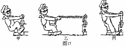 26.如图17甲所示,工人正试图用扳手拧松工件上一个紧固的螺母,尽管他使出了浑身力气,却没能成功。小明和小刚同学看到后,利用所学物理知识分别给他设计了一个新点子:小明设计的是在其它不变的情况下,取来一根绳子,将绳的一端系在扳手柄的上端,使劲拉绳的另一端,如图17乙所示。小刚设计的是在其它不变的情况下,取来一个较长的套筒,将套筒套在扳手柄上,用力扳套筒的上端,如图17丙所示。则: