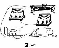 我们知道干燥的苹果表面覆盖有一层绝缘的蜡质物。 可研究小组在探索中意外发现苹果的柄和苹果底部向内凹进的部分竟然是导电的,好象两个天然的电极。请用笔线代替导线,在图14中完成测量苹果电阻的实验电路。