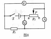 15.图8所示电路中,电源电压恒定,只l为定值电阻,及:为滑动变阻器。闭合开关S后,滑动变阻器滑片尸自b向a移动的过程中