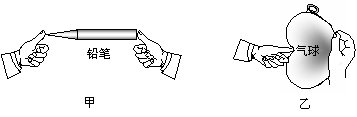在探究“压力作用的效果与哪些因素有关”的活动中,同学们首先进行了热烈讨论和大胆猜想,接着设计了多种验证方案。然后,李亚同学按图甲所示进行操作,她觉得左拇指受压的感觉比右拇指要强得多;并且越用力,受压感觉越明显。徐真同学的实验如图乙,他观察到与手掌接触部分气球的形变较小,而用手指顶着的那部分气球形变明显;且手指用力越大,形变越明显。