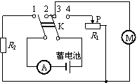 31.在今年5月份助残活动中,某校初三同学为伤残军人买了一辆电动轮椅。同学们对这辆车的工作原理产生了兴趣。他们对照说明书的电路原理图(如图所示)了解到,操纵杆可操纵双刀双掷开关K以及滑动变阻器R1的滑片P。前推操纵杆时轮椅前进,再向前推时快速前进;后拉操纵杆时轮椅慢慢后退。又知蓄电池的电压U=24V(保持不变)、定值电阻R2=10Ω,电动机的额定功率P0=72W、额定电压U0=24V。