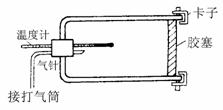 26、如图所示,原器容器的一端通过胶塞插进一只温度计和一根气针,另一端有一可移动的胶塞(用卡子卡住),用打气筒慢慢地向容器内打气,增大容器内气体的压强,当瓶内气体压强大到一定程度时,读出温度计的示数t1;打开卡子,让气体冲开胶塞,这时再读出温度计的示数t2,回答问题:
