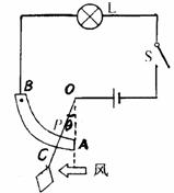 31、(7分)一位同学设计了一个风力测定仪,如图所示,O是转动轴,OC是一根细金属杆(自重不计),下面连接一块受风板,重20N,无风时OC是竖直的,风越强,OC杆偏转角度θ越大。AB是一段圆弧形电阻,P点是金属杆和圆弧形电阻的接触点,电路中接有一个小灯泡,测风力时,闭合开关S即可。通过分析可知:金属杆OC与弧形电阻AB组合在一起相当于一个________,通过观察小灯泡的________,可以粗略地知道风力的大小。