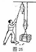 36.工人利用如图25所示的滑轮组将重900N的物体竖直向上匀速提升O.5m,工人对绳的拉力为600N,则滑轮组对重物所做的有用功多大?该滑轮组此时的机械效率多少?若另一名力气较小的工人只能用400N的力拉绳,则他最多能提起多重货物?