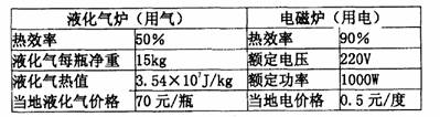 21 液化气炉是人们目前普遍地使用的炉具,而电磁炉则是新一代的智能炉具。为了比较它们的耗能费用,小明进行了下列调查,得出了如下两组数据: