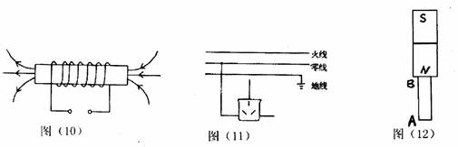 24、如图(12)所示,AB 为软铁片,吸在条形磁铁的下面,请标出软铁AB 的磁极。当软铁AB 离开条形磁体后,去接触大头针,此时AB 能否吸引大头针?简要说明原因,