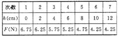 小王为了探究物体在水中不同深度所受浮力变化情况,如图7所示,将一挂在弹簧测力计下的圆柱体金属块缓慢浸人水中(水足够深),在圆柱体接触容器底之前,分别记下圆柱体下表面所处的不同深度h和弹簧测力计相应的示数F,实验数据如下表:
