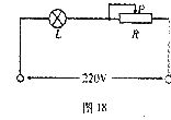 王宏同学在实践活动中自制了一个可调节亮度的台灯,他设计的电路如图18所示.灯泡上标有“220V 40W”,滑动变阻器R上标有“990