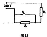 2.(8分)有一种电饭锅,其内部电路如图l3所示。R1是加热电阻,阻值为96.8Ω,R2是限流电阻。S闭合时处于加热状态,S断开时处于保温状态。电饭锅加热状态和保温状态所消耗的总电功率之比为l0∶1,请问: